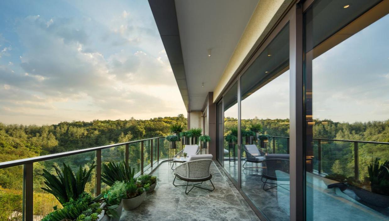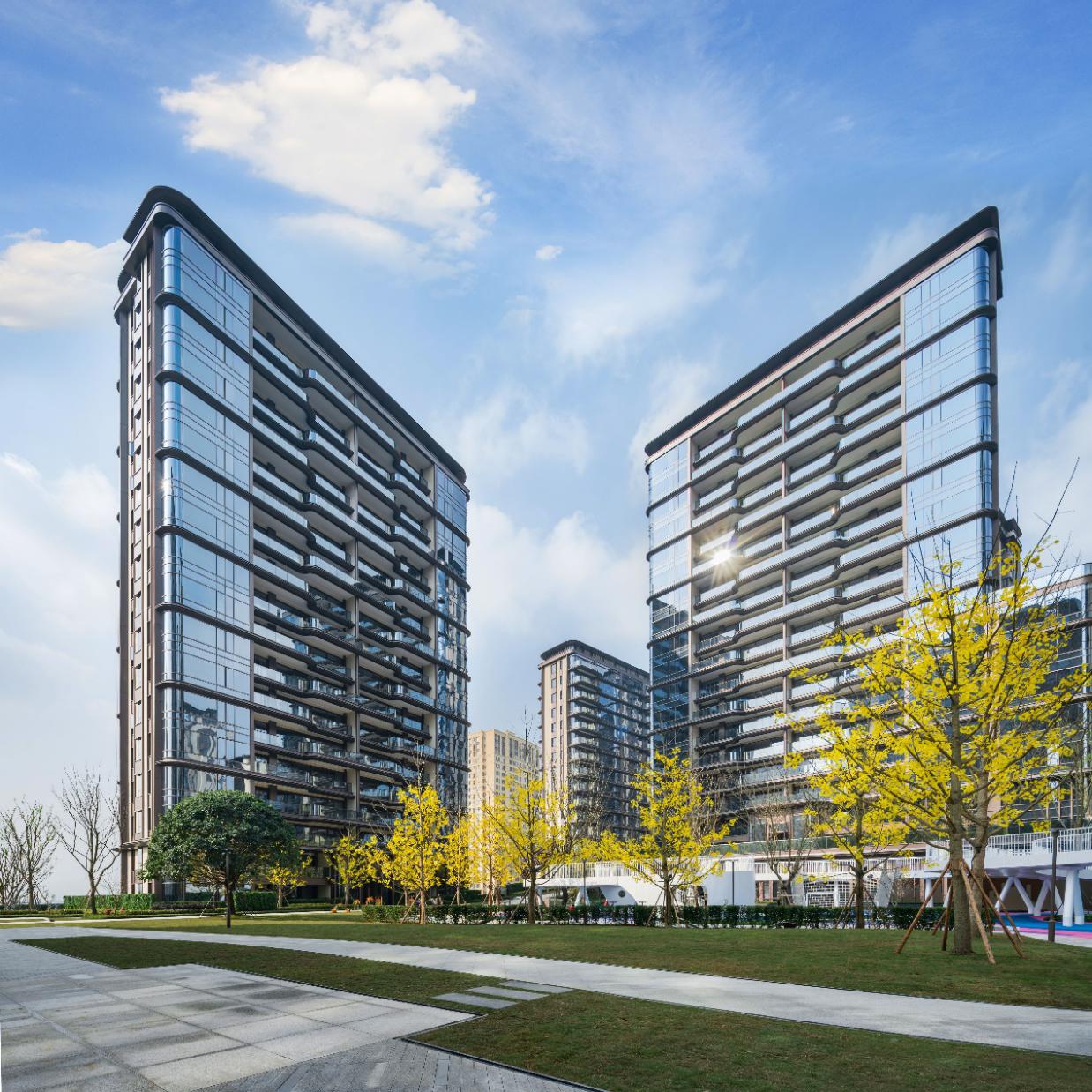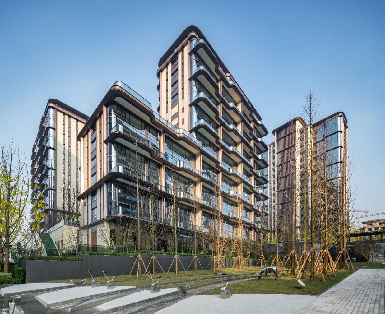 外立面設(shè)計(jì)上引用藏山納水的設(shè)計(jì)理念,形態(tài)上舍棄了傳統(tǒng)住宅的剛正形象,采用弧形立面設(shè)計(jì),將山的剛毅,與水的柔和完美演繹,宛如生長在照母山上的植物一般,充滿生命力。
