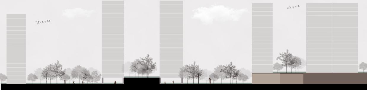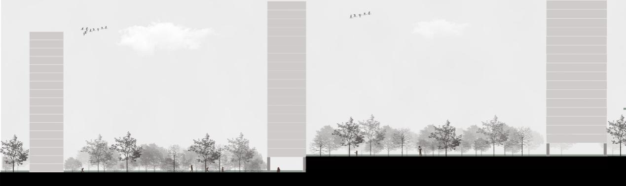 利用多個(gè)架空層、平臺(tái)、電梯等設(shè)計(jì)消化場(chǎng)地內(nèi)的高差。架空層內(nèi)部設(shè)計(jì)合理人居場(chǎng)景,綠色和生態(tài)的結(jié)合,在每一個(gè)架空層內(nèi)規(guī)劃了與生活功能相關(guān)的場(chǎng)景應(yīng)用,從而形成一個(gè)“mini生活mall”。