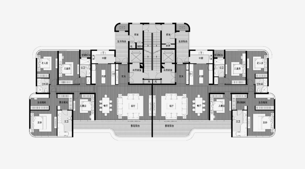 “當(dāng)人類用感情和希望去創(chuàng)造一樣?xùn)|西,那一樣?xùn)|西就會(huì)被賦予靈魂。” 設(shè)計(jì)師對(duì)于居住人群生活方式的研究,利用空間設(shè)計(jì)不僅使家庭活動(dòng)緊密團(tuán)結(jié),又給予各自私密空間。起居室的比例安排、對(duì)空間的正式與非正式程度的感知及入口空間的位置都是設(shè)計(jì)師在理解人類的生理和心理行為后所確定的。9米橫廳,2米陽臺(tái),弧形轉(zhuǎn)角窗都為居住者提供最佳景觀條件。