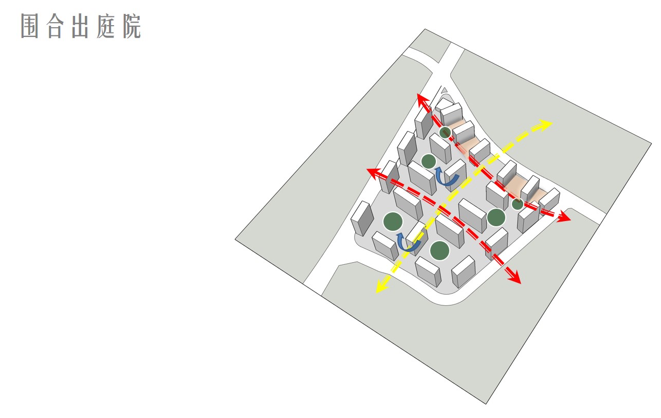 “門-庭-院”的遞進(jìn)布局,滲透古典園林建筑的“隱逸美學(xué)”。傳承家族門儀,闊朗門庭、雅靜園林、入戶庭院三重顯赫規(guī)制,一條歸家路,移步異景間。遠(yuǎn)近親疏的尺度、公共到私密的關(guān)系循序演繹,將道路分割的地塊用景觀連接,形成山體與景觀的自然延伸。