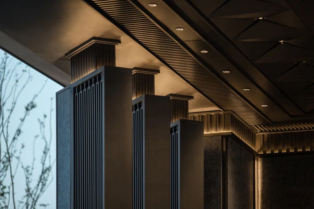攬境傾向于現(xiàn)代化的藝術(shù)表達(dá)方式,約38m酒店式星空門頭和巨型迎賓水瀑締造高端奢雅的酒店式氛圍,依照黃金分割弧線切入的天空消解了暗色、材質(zhì)與體量帶來的壓迫感。