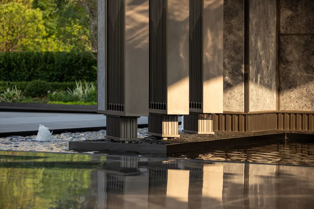 石材與金屬無處不在碰撞,不同紋理間組成獨特韻律,干凈而純粹的表達(dá)透露出精致,融合景觀,達(dá)到景觀建筑一體化,人與自然和諧共生。