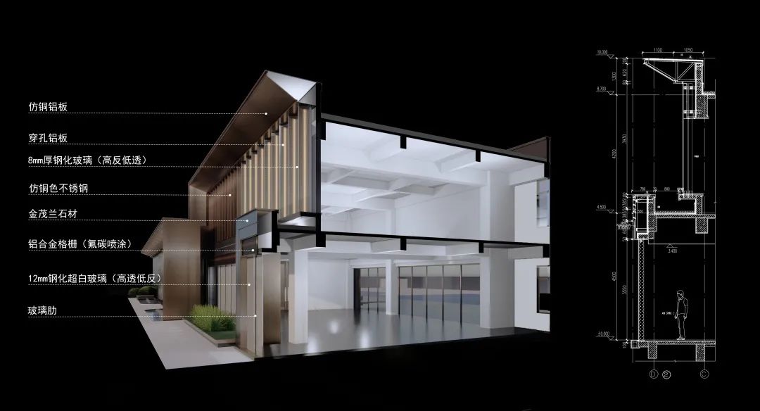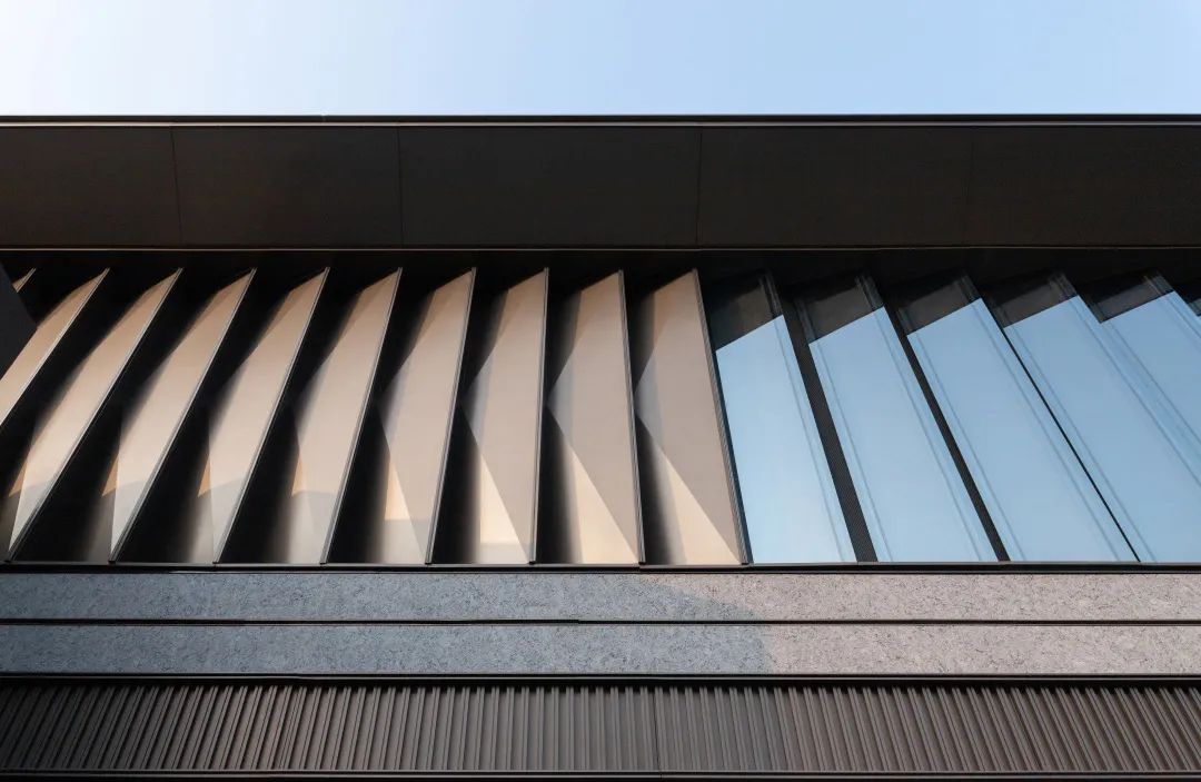建筑立面風(fēng)格時尚而簡約,二層折行玻璃+弧形穿孔鋁板內(nèi)藏?zé)艄?,泛光透過穿孔鋁板形成“星河”效果與吊頂呼應(yīng)。材質(zhì)交接自然過渡,形體與交接咬合關(guān)系清晰。首層采用高透低反的平面玻璃,以便更好地向外展示,二層則采用高反低透的鋼化玻璃折行排布。