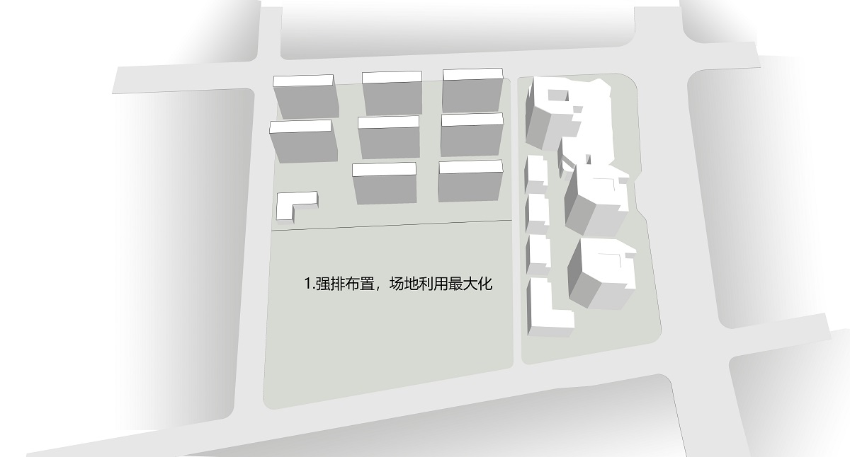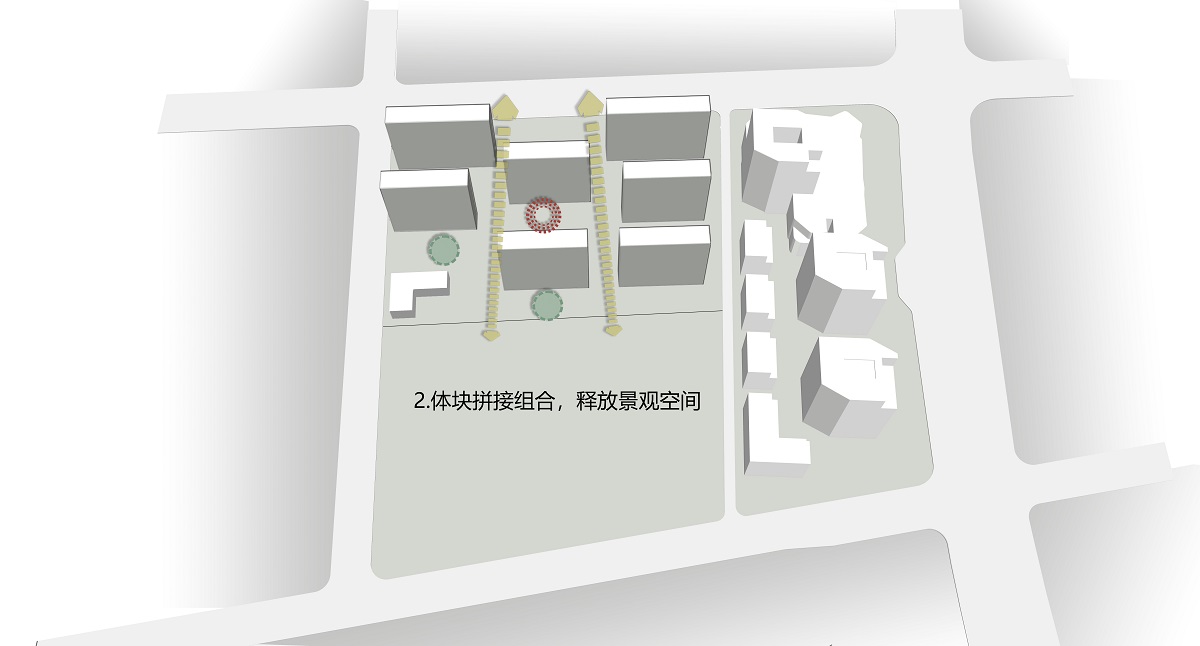 項(xiàng)目用地局促,面臨的首要問(wèn)題就是如何在較高容積率下進(jìn)行合理的空間布局。為保證小區(qū)北側(cè)入口區(qū)域一定的空間退讓,滿足沿城市道路界面的通透率,住宅樓棟采用錯(cuò)位行列式布局,并由此形成幾個(gè)相互穿插滲透的庭院空間。兩者之間的關(guān)系合理的處理,加強(qiáng)了內(nèi)外之間的空間連續(xù)性。通過(guò)全區(qū)景觀洄游路徑的設(shè)置,實(shí)現(xiàn)小中見大,步移景異的空間效果。