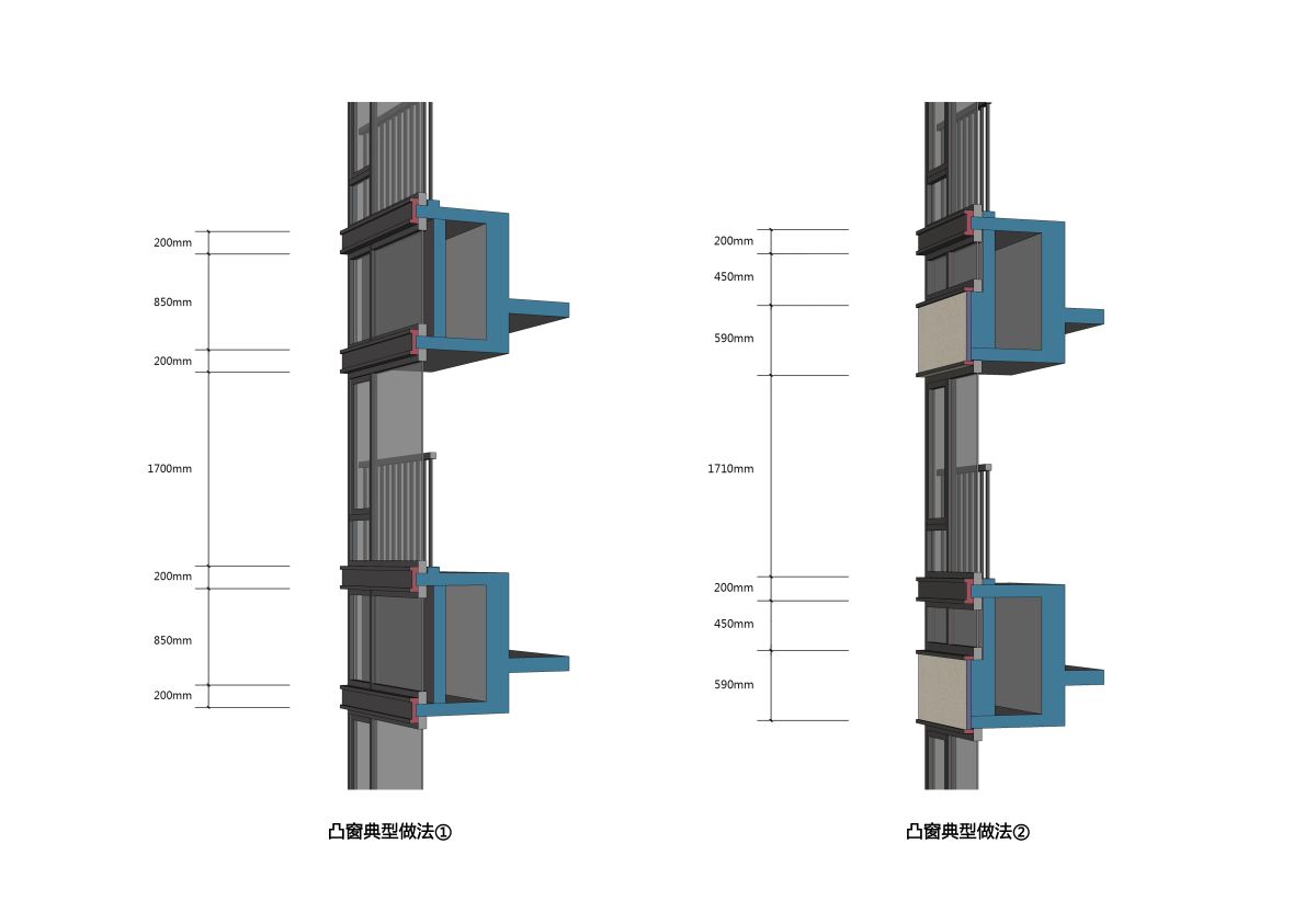 立面設(shè)計(jì)由于引入了類幕墻窗系統(tǒng)和一體板幕墻系統(tǒng),對(duì)節(jié)點(diǎn)的精細(xì)化設(shè)計(jì)和施工均提出了很高的要求,門窗洞口不同材料的收邊收口做法尤為精準(zhǔn)復(fù)雜。設(shè)計(jì)團(tuán)隊(duì)通過(guò)對(duì)不同尺度線條的對(duì)比研究和施工可控性研究,最終確保了的立面完成度的實(shí)現(xiàn)。