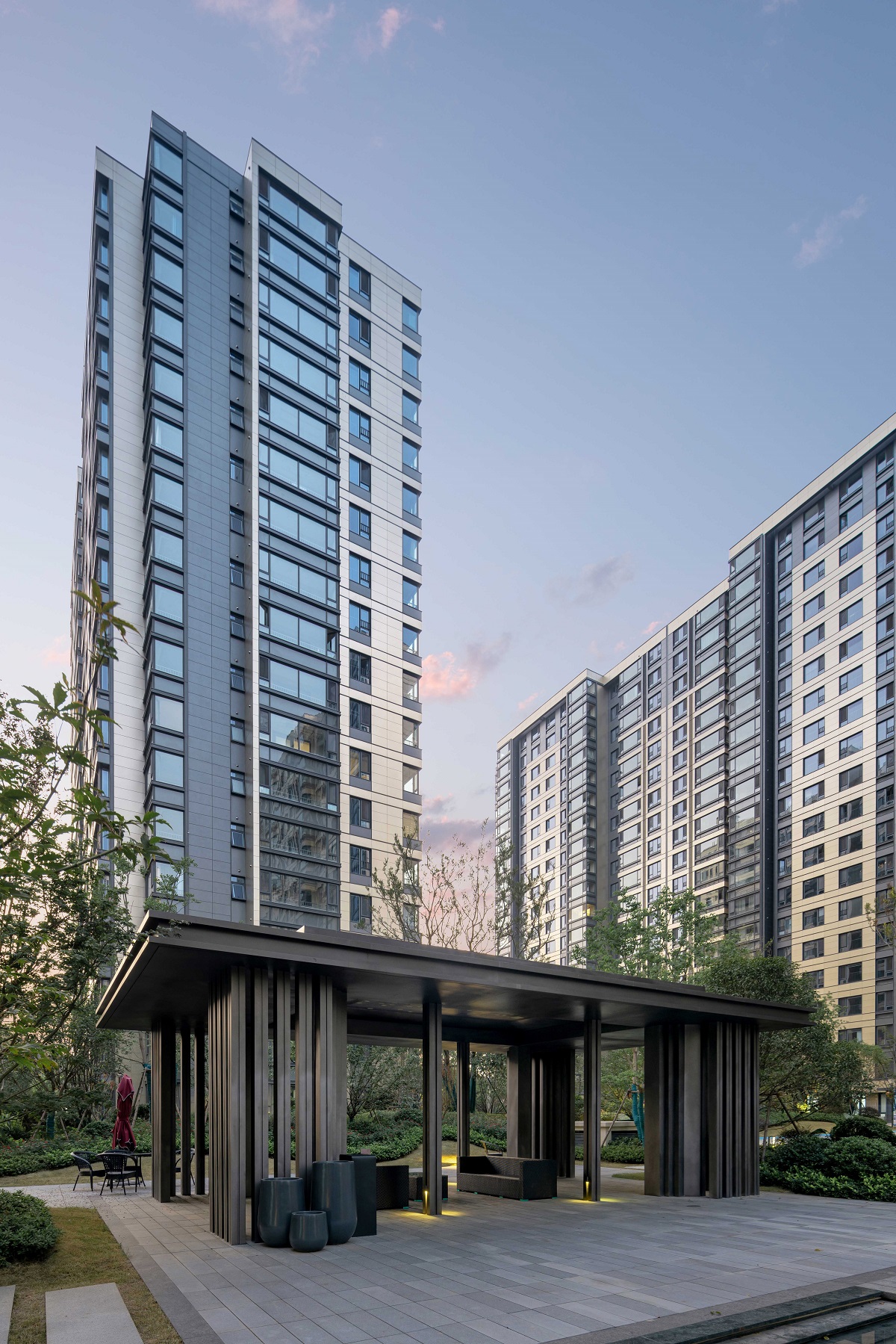 住宅立面的公建化,“高冷灰”并非唯一的選擇,建筑應(yīng)回應(yīng)生活中的溫情,應(yīng)回應(yīng)天光四時(shí)的變化。項(xiàng)目外立面主材采用了淺香檳金色一體板和深灰色一體板的組合,兩種板材一暖一冷,互為調(diào)和。板材中均添加了金屬顆粒成分,建筑立面在陽(yáng)光下呈現(xiàn)一種簇新、光亮的效果,猶如覆蓋一層淺淺的光暈,且在一天早晚不同的光照條件下呈現(xiàn)明暗細(xì)微的變化。
