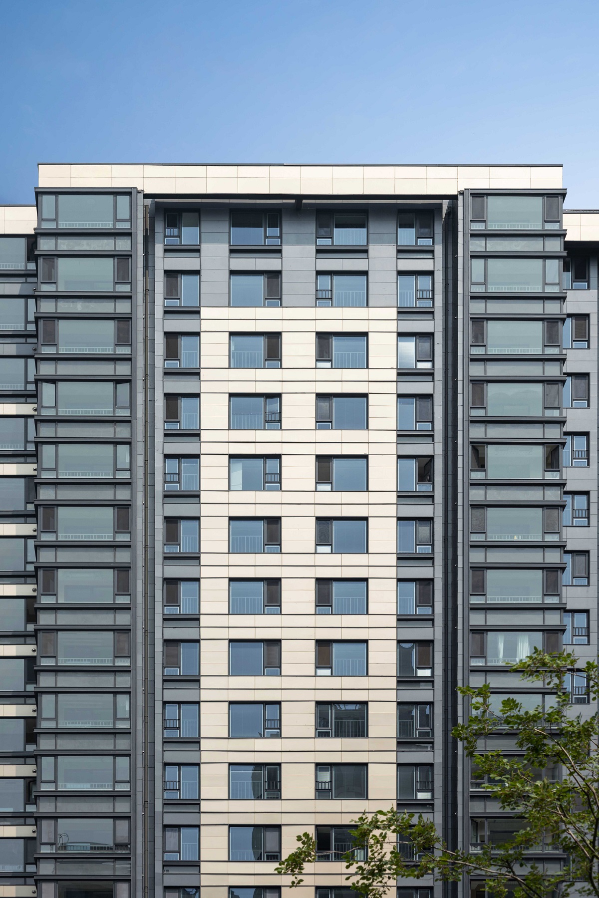 鑒于基地周邊多為商辦公建且臨近城市干道,設(shè)計(jì)伊始住宅就已定調(diào)為公建化立面。設(shè)計(jì)團(tuán)隊(duì)從建筑形體的比例關(guān)系著手,引入類幕墻窗系統(tǒng),在建筑整體的形體內(nèi)通過(guò)虛實(shí)關(guān)系的提煉和優(yōu)化,具有更明顯的昭示感。最終呈現(xiàn)一個(gè)比例合宜、整潔、輕盈的立面效果。