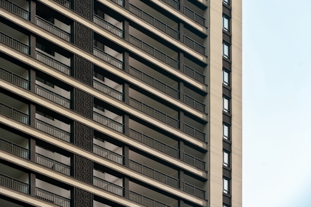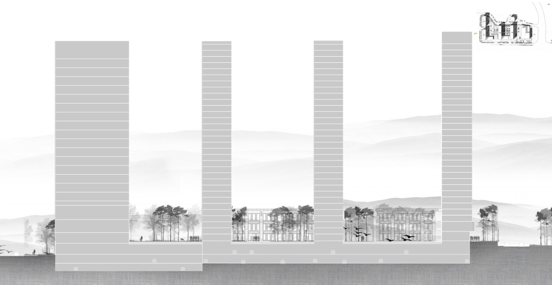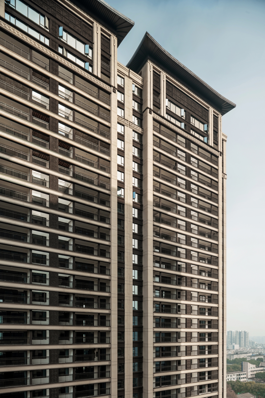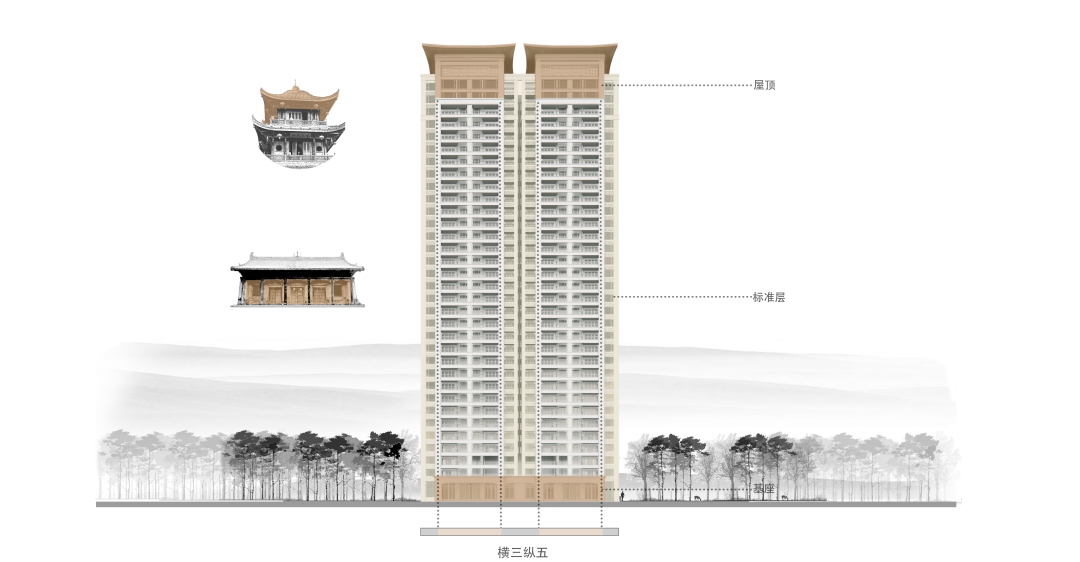 不僅在大門、二進(jìn)院等位置強(qiáng)調(diào)唐代建筑出檐深遠(yuǎn)的特點(diǎn),更是在高層住宅上創(chuàng)新地嘗試飛檐的設(shè)計(jì)手法,這無疑對設(shè)計(jì)及施工都是一個巨大的考驗(yàn),在不斷地深化和積累后,形成了獨(dú)特的“唐風(fēng)飛檐”的特色。
