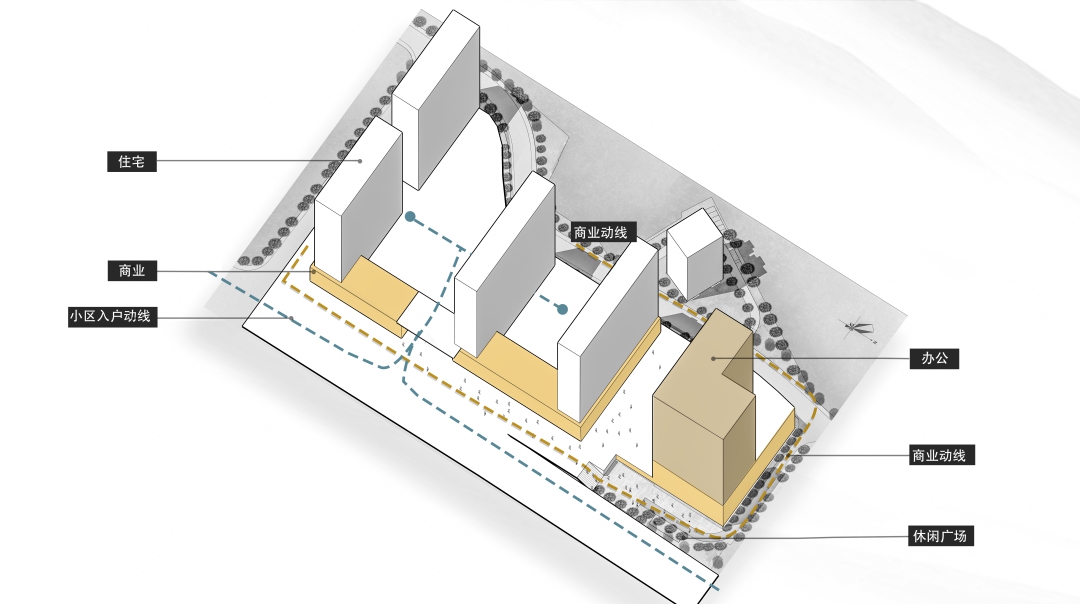 沿街的界面產(chǎn)生人流動線,從小區(qū)入戶的住宅、商業(yè)到鄰近的辦公樓功能延續(xù)性的交織,將每一個建筑單體與空間流線充分的體現(xiàn)了連續(xù)性與整體性的特征。