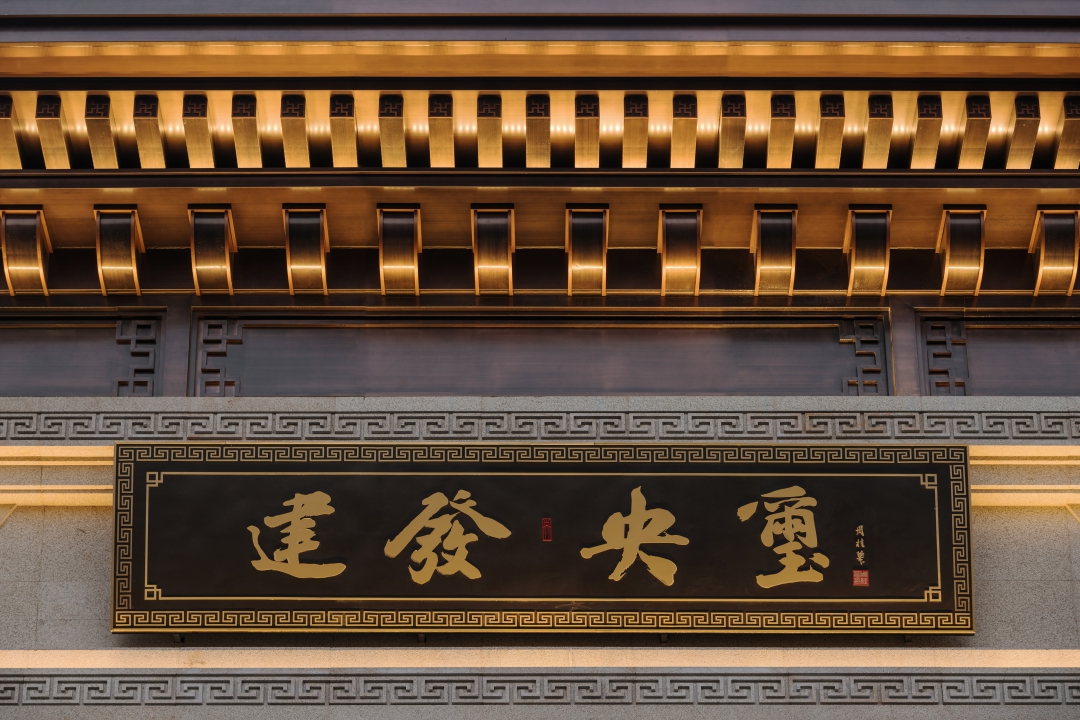 傳統(tǒng)符號進(jìn)行抽象化和幾何化處理,隱喻了中國傳統(tǒng)文化的同時表明了其現(xiàn)代化的特征,石材的構(gòu)造特性、美學(xué)特性創(chuàng)造形式上的視覺美感,借助色彩、光感、質(zhì)感、紋理、材料的相互穿插與交織,形成忽隱忽現(xiàn)的具有特殊韻律美的外觀形式。