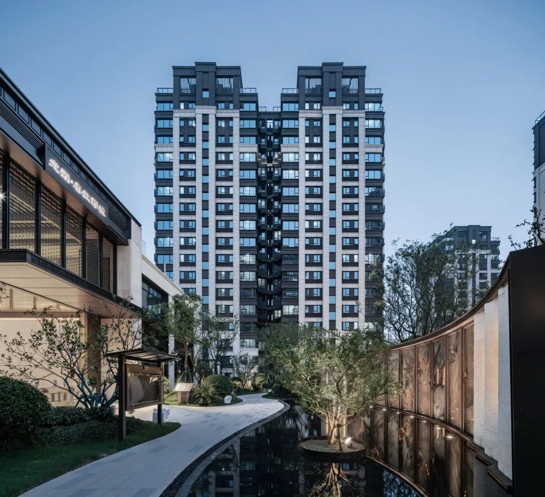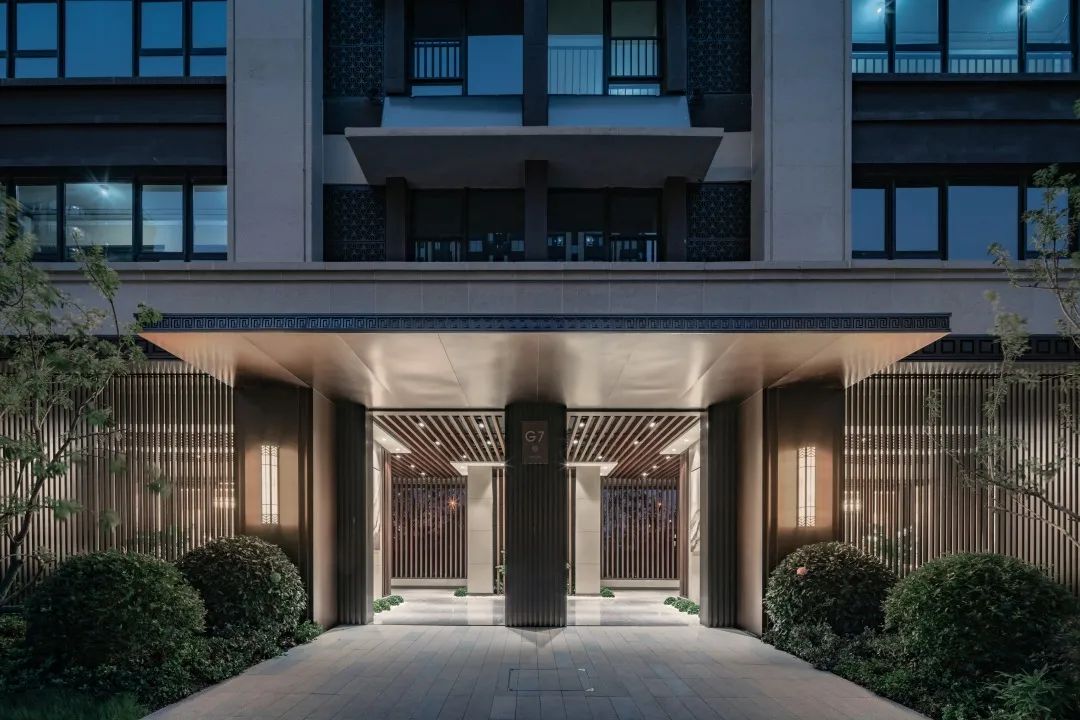 住宅單元入口以近4米的門頭高度,全石材加仿銅拉絲不銹鋼,雕琢出歸家的儀式感。提取中式祥瑞元素,利用祥云符、如意符、回字紋及錦紋,營造尊崇感。
