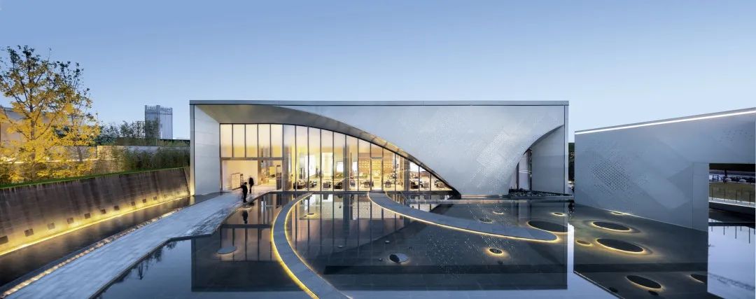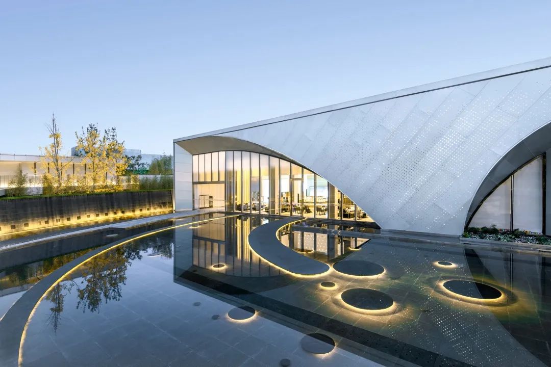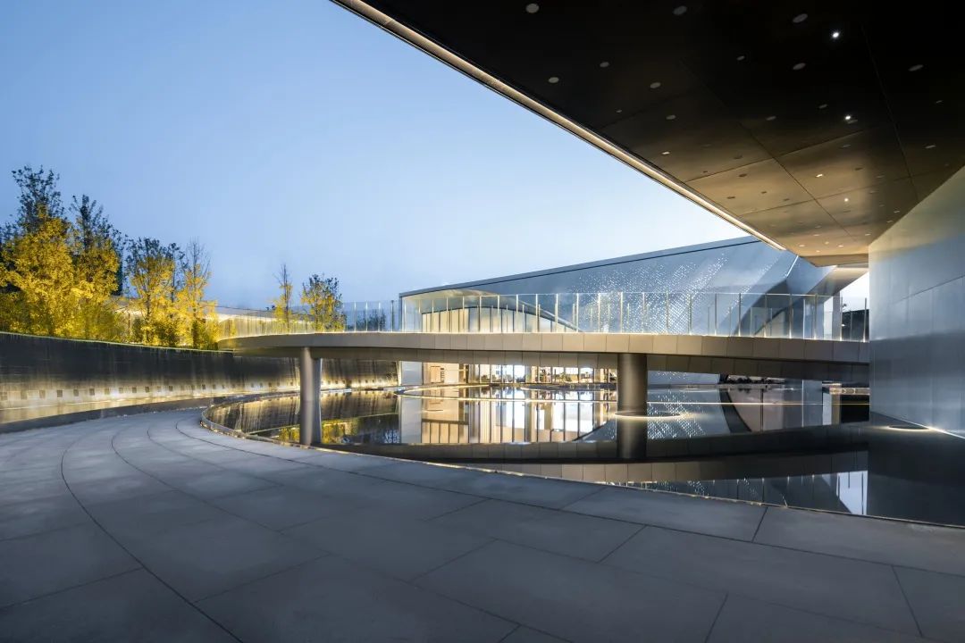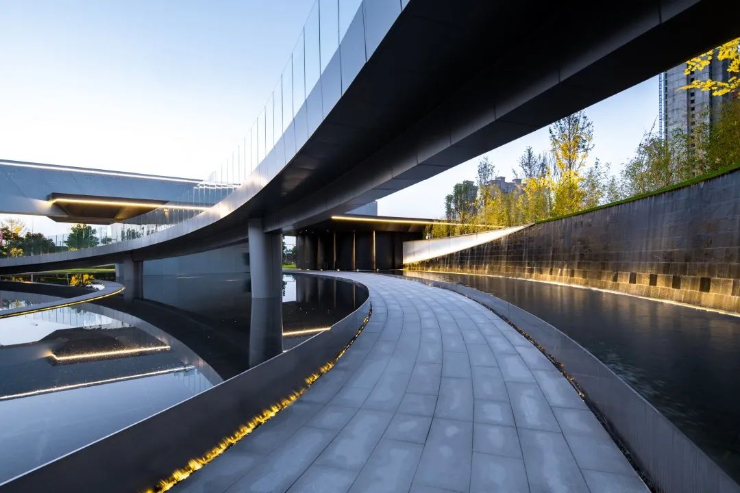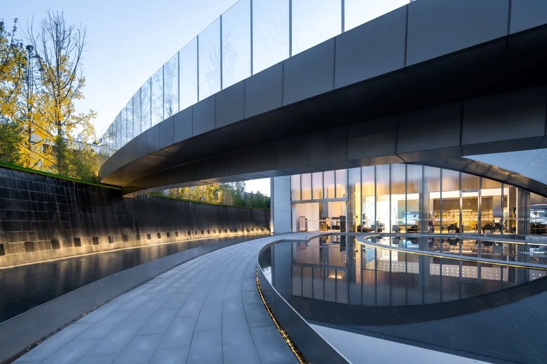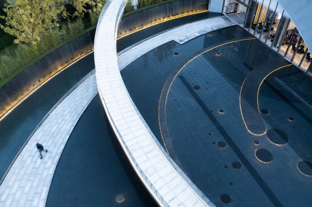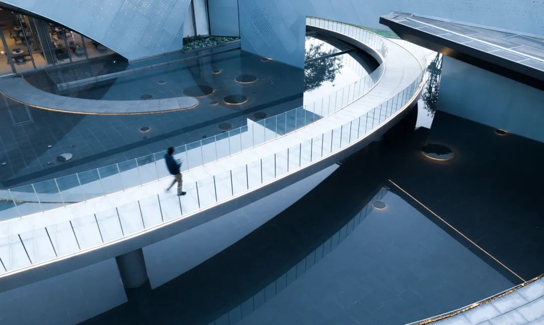 空間與視覺的連續(xù)性:立面的墻體通過藝術(shù)創(chuàng)作產(chǎn)生視覺上的肌理感,將光與影帶入到空間中,微風(fēng)拂過水波倒影連廊起伏,層層漣漪之上倒映出朦朧的樹影與建筑。運用玻璃等半透明材料,舒朗別致的造型結(jié)構(gòu)打破景觀與建筑的界限,打造空間與視覺的連續(xù)性與純凈性。
