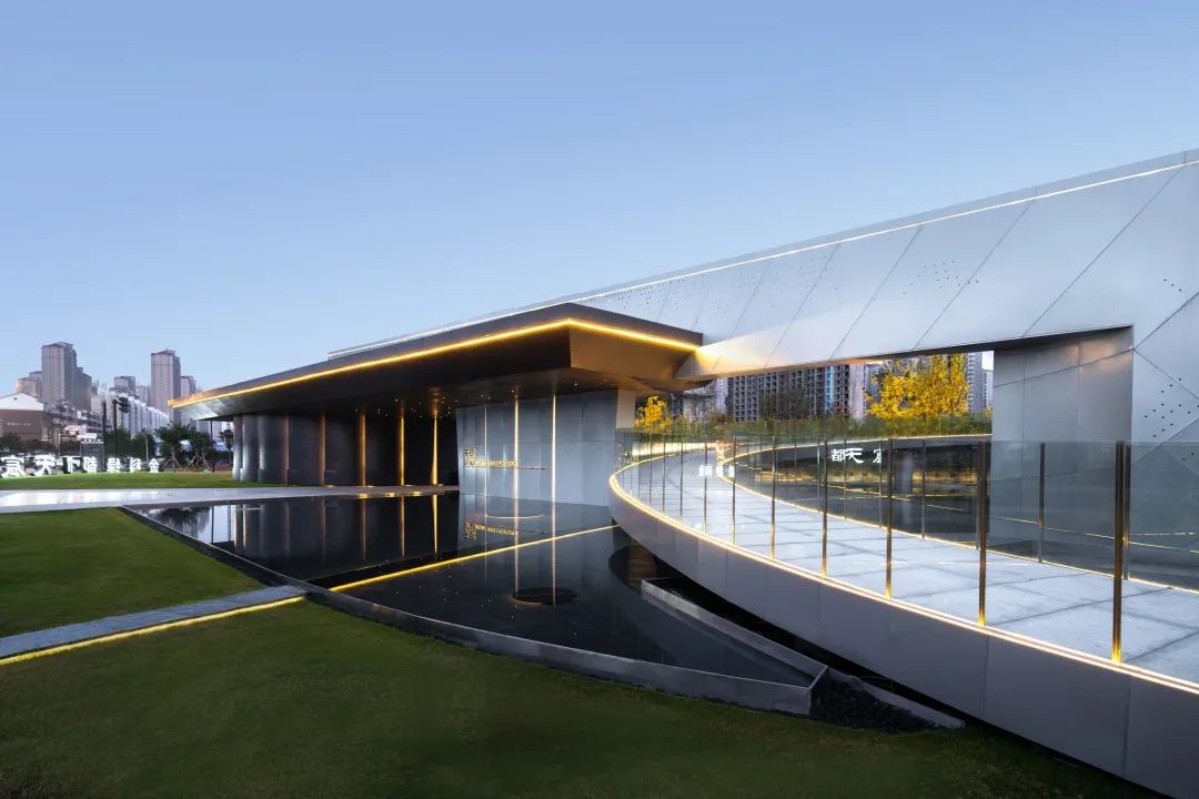 獨特的示范區(qū)入口門頭設(shè)計,三角形交錯切割搭的頂蓋搭配弧與圓變形拼接的墻體,選用與建筑表面相同的鋁板材質(zhì),讓每一個到訪的客戶都能體會到尊貴大氣的儀式感。大門整體框架為線條設(shè)計感十足的多邊幾何形,肆意張揚的角,似無限延伸的線,百變的面富有動感。“迎”、“聚”、“觀”一氣呵成。整體為黑白色調(diào),純粹簡約,同樣不缺少高級質(zhì)感。從內(nèi)延伸至外的水面,倒映著藍(lán)天白云,似天地顛倒闖入一片幻境,似夢而非夢。