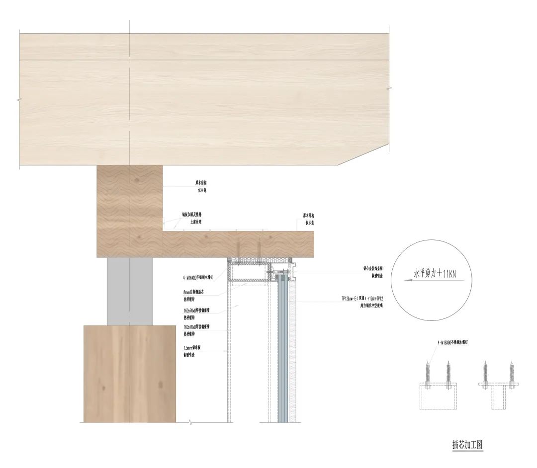 幕墻與木結(jié)構(gòu)連接處,由于木結(jié)構(gòu)的特殊性無(wú)法進(jìn)行常規(guī)的焊接操作。一般的操作方法是采用對(duì)穿螺桿的形式,對(duì)于安裝精度要求太高,且需要保證加強(qiáng)鋼板、插芯底板、木板孔的位置均無(wú)誤差才能進(jìn)行有效安裝。技術(shù)團(tuán)隊(duì)經(jīng)過(guò)實(shí)踐,研究設(shè)計(jì)出幕墻的插芯采用螺釘直接連接,現(xiàn)場(chǎng)可操作性較強(qiáng)。由于幕墻為下端支撐,上端僅有風(fēng)荷載和水平地震產(chǎn)生的水平剪力,相對(duì)于條狀的木板來(lái)說(shuō),受力方向非常有利,安全性極強(qiáng)。