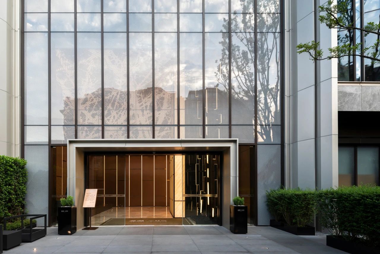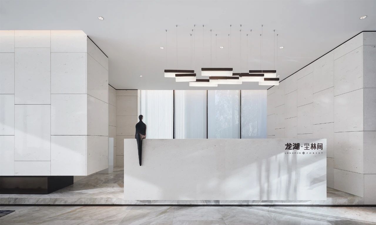 由于塵林間地塊與鄰近路面存在高差關系,大堂采用了雙層設計。大堂頂部穿孔鋁板以及配合樹形投影設計,盡藏生活哲學,體驗不可度量的生活儀式感。