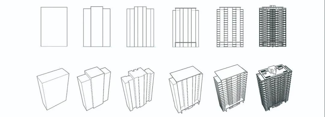 住宅立面多結合采用涂料、多彩漆、鋁板、玻璃等建筑材料;色彩運用方面穩(wěn)重、大方,基部和頂部均用鋁板材料,頂部造型簡潔方正,提升了建筑的精氣神。