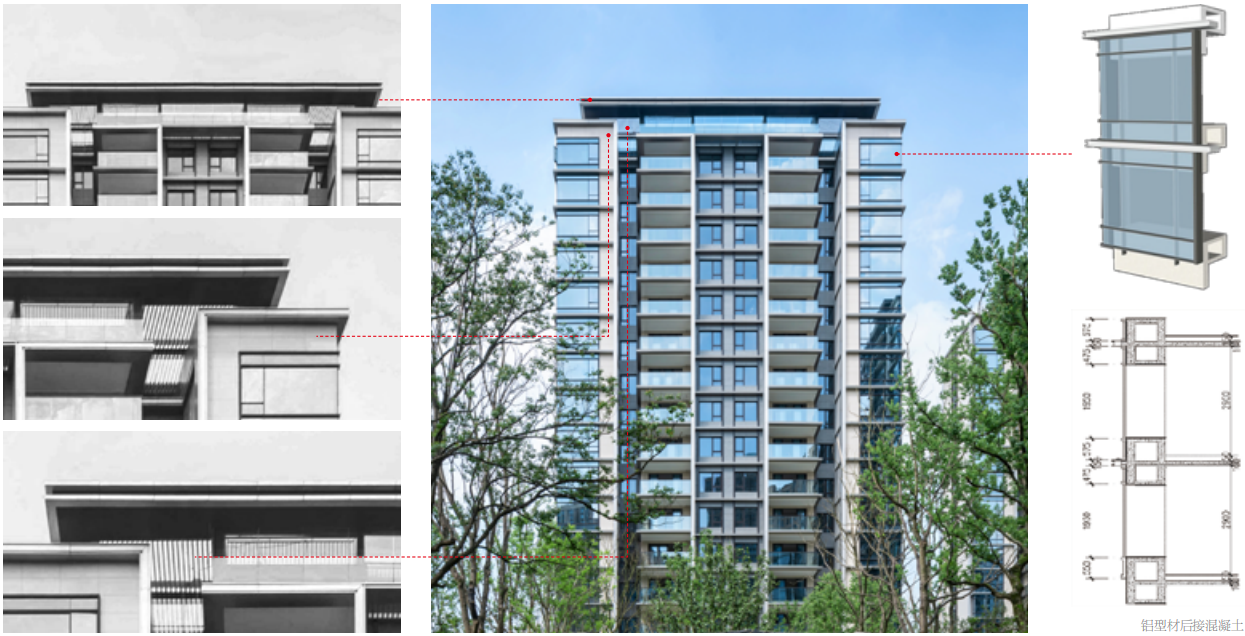 與主體接觸之間凹槽等細節(jié)處理;頂部鋁板局部百葉細節(jié)處理;創(chuàng)新類幕墻窗的設計,保證了建筑擁有最大面積的玻璃面,彰顯現(xiàn)代建筑的干凈與簡潔。