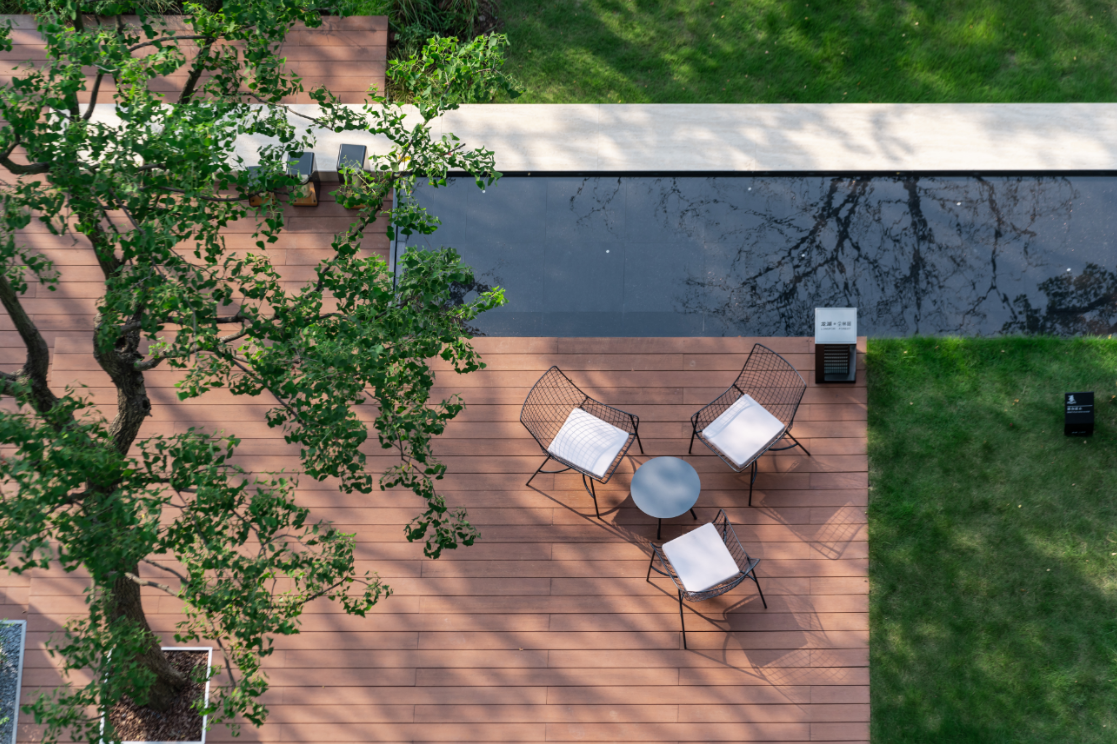 隨著電梯升至半山的高度,一片栽滿了烏桕木、香樟樹、銀杏和水杉木的樹陣。樹陣周圍,環(huán)繞著一泓精心打造的水景, 營造出“泉眼無聲惜細流,樹陰照水愛晴柔”的意境。