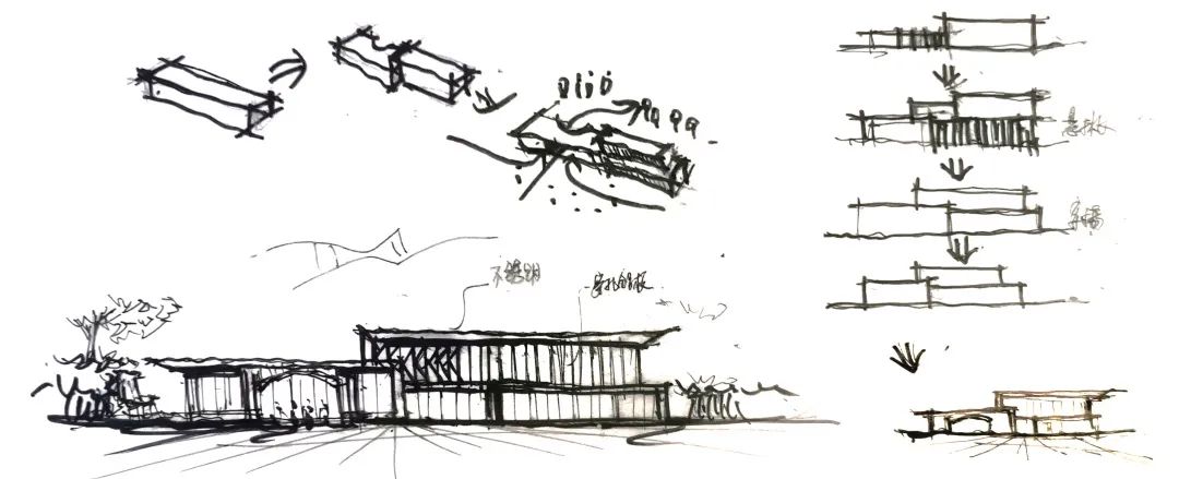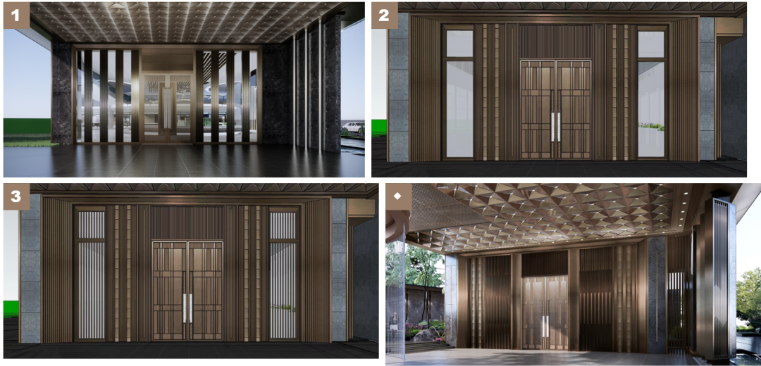 通向室內(nèi)空間的入口門用均分格柵的方式略顯笨重,增加長條窗戶后采用了更為纖細(xì)輕盈的格柵,但為了保護(hù)室內(nèi)的隱蔽性,最終去除了玻璃窗,增加鱗片狀韻律造型排布于兩側(cè),用格柵進(jìn)行虛實過渡。