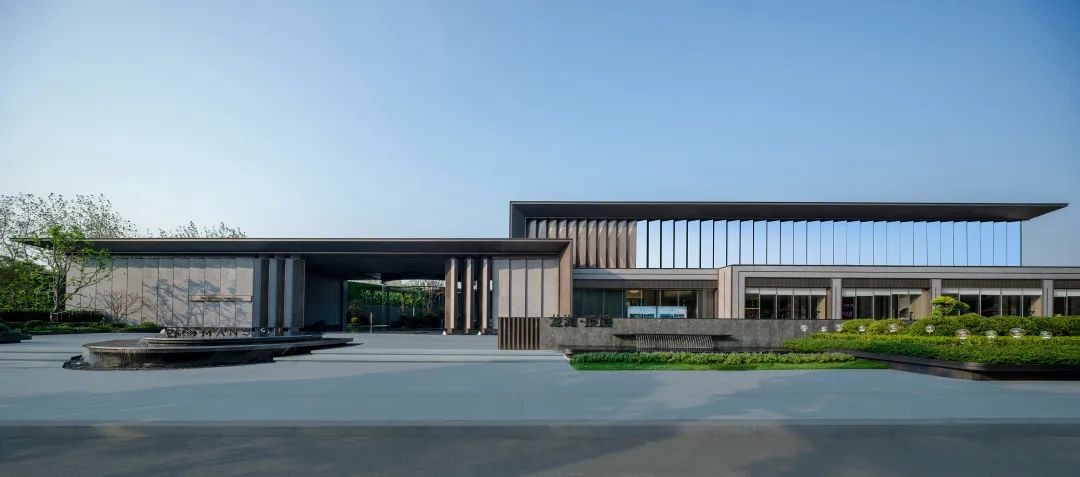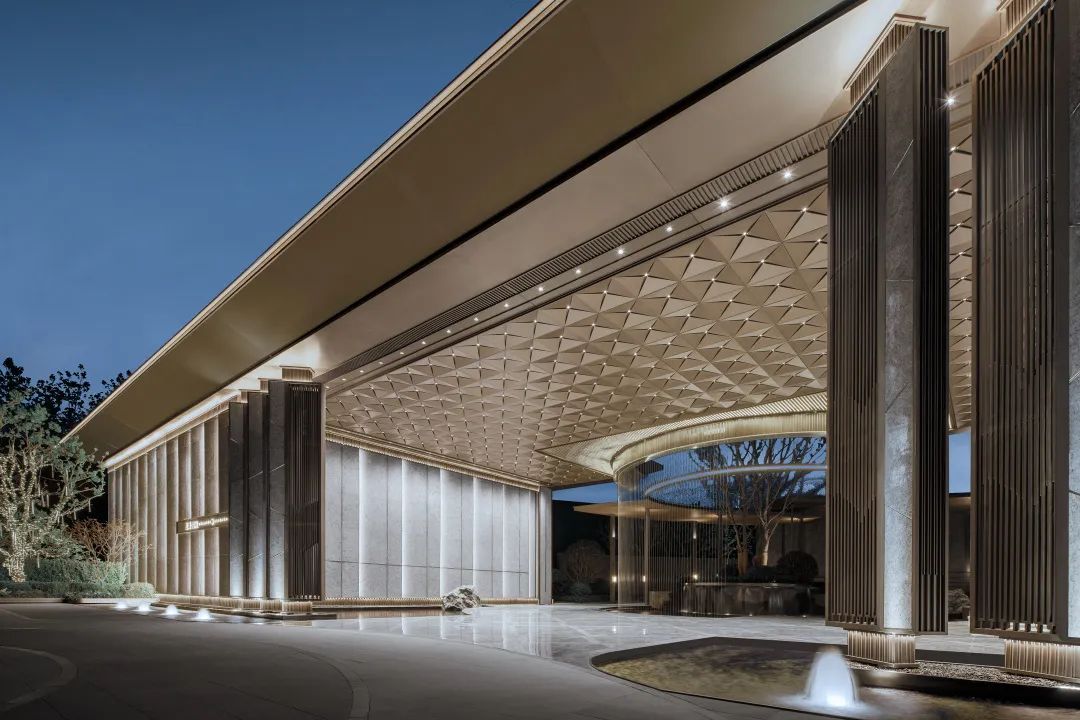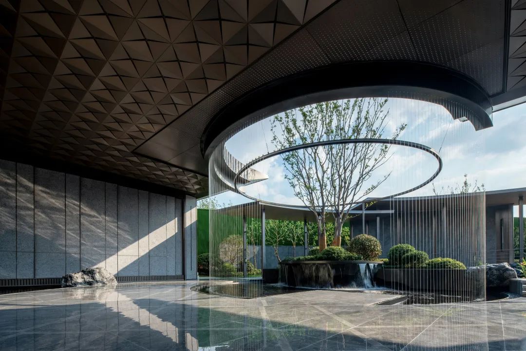 攬境傾向于現(xiàn)代化的藝術(shù)表達(dá)方式,約38m酒店式星空門頭和巨型迎賓水瀑締造高端奢雅的酒店式氛圍,依照黃金分割弧線切入的天空消解了暗色、材質(zhì)與體量帶來的壓迫感。