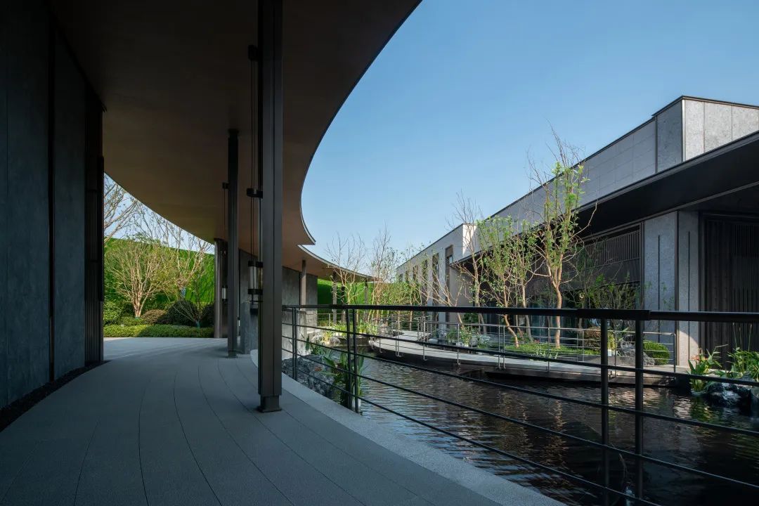 入口隔開了城市的喧囂,開敞式的設(shè)計如同畫框,步入后亦可回望繁華之色。沿著黃金比例柔和的弧線景觀連廊和水上浮橋從自然中生長,圈一域水景,籠一方寧靜。