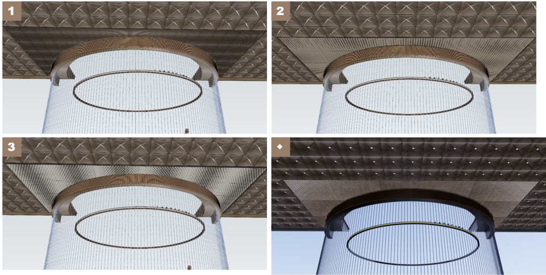 主入口星空吊頂結(jié)合景觀水幕圓環(huán)排版,在圓環(huán)交接位置增加漸變穿孔鋁板設(shè)計,背襯亞克力加泛光與星空吊頂呼應(yīng)。最初選用豎向格柵,但排列板直,過于簡單,后采用較為輕盈的穿孔鋁板,與吊頂形成呼應(yīng),但圓形穿孔方式與吊頂肌理沒有呼應(yīng)關(guān)系,改為三角形穿孔紋理形式,與吊頂斜切內(nèi)凹造型相呼應(yīng),由疏到密往圓環(huán)漸變過渡。