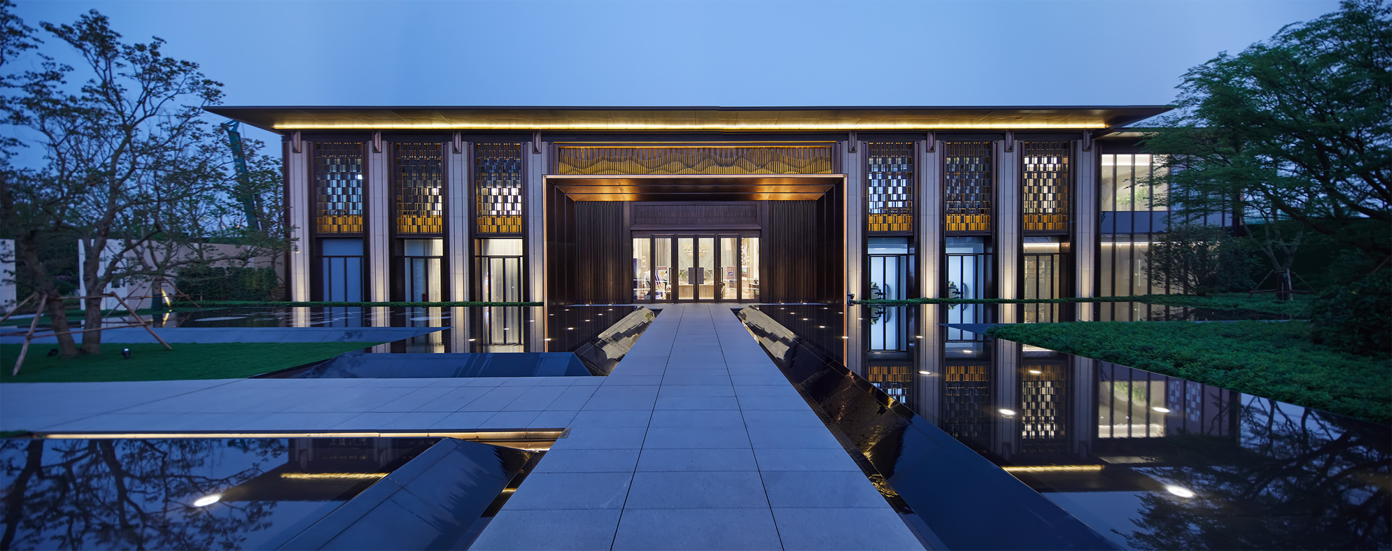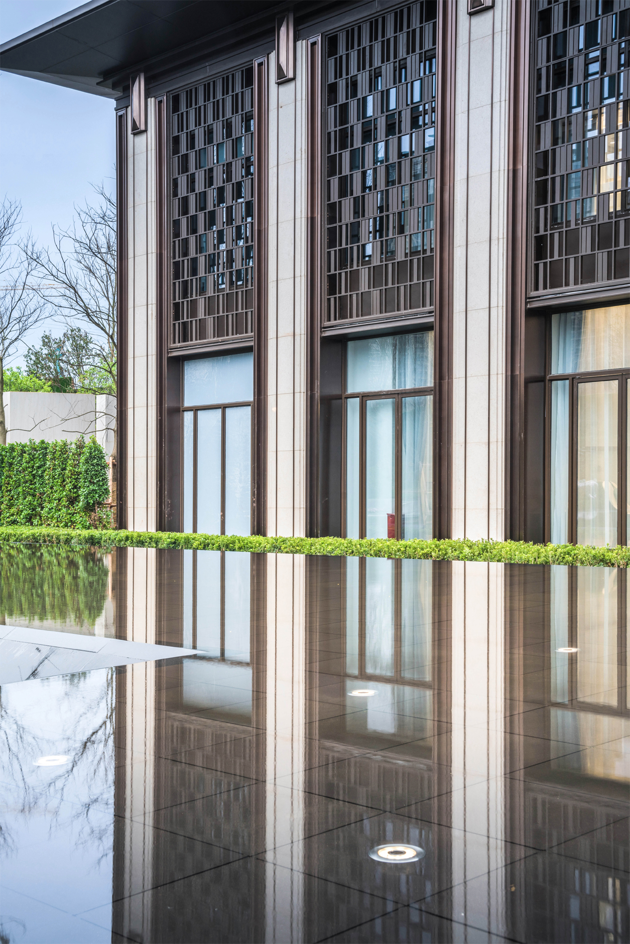 建筑形制提取古建筑的中軸對稱開間的元素,遞進有序。以銅制裝飾柱形成纖細(xì)的柱廊序列,賦予生活莊嚴(yán)大美的儀式感,禮賢有序的禮制之美。不僅一梁一柱都要進行藝術(shù)加工,著力于建筑細(xì)部的刻畫,并且對于裝飾更是細(xì)致處理。