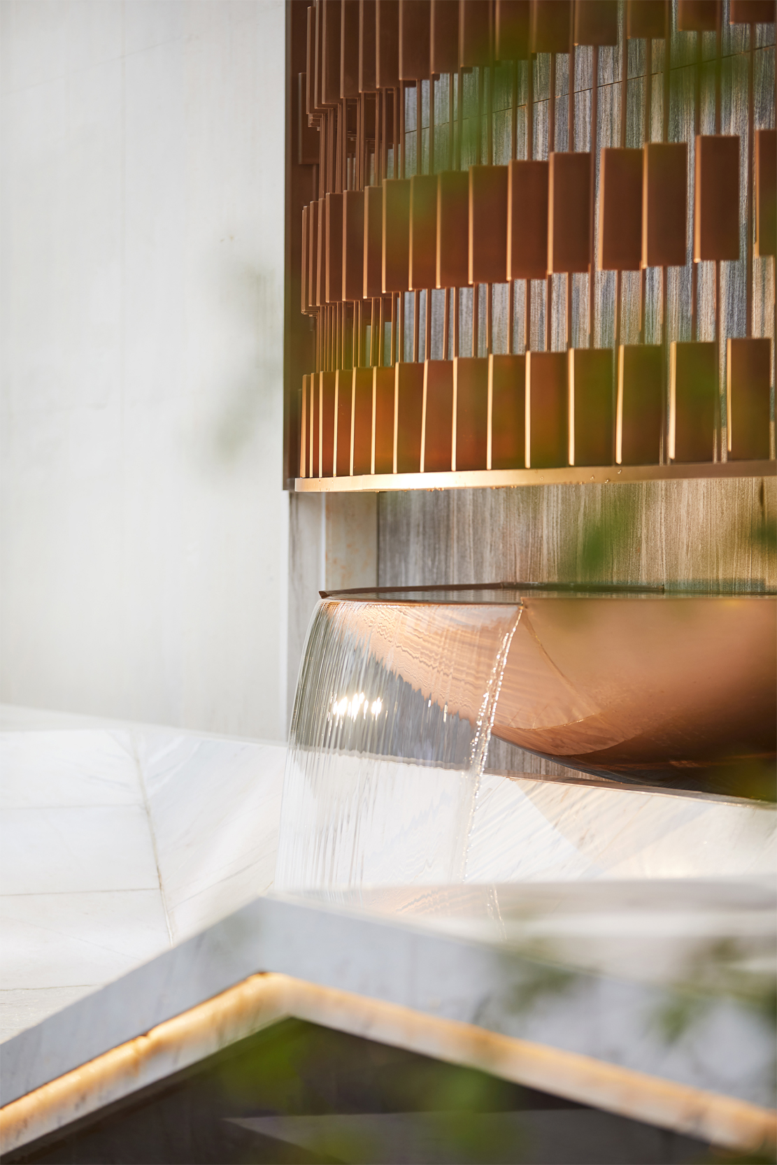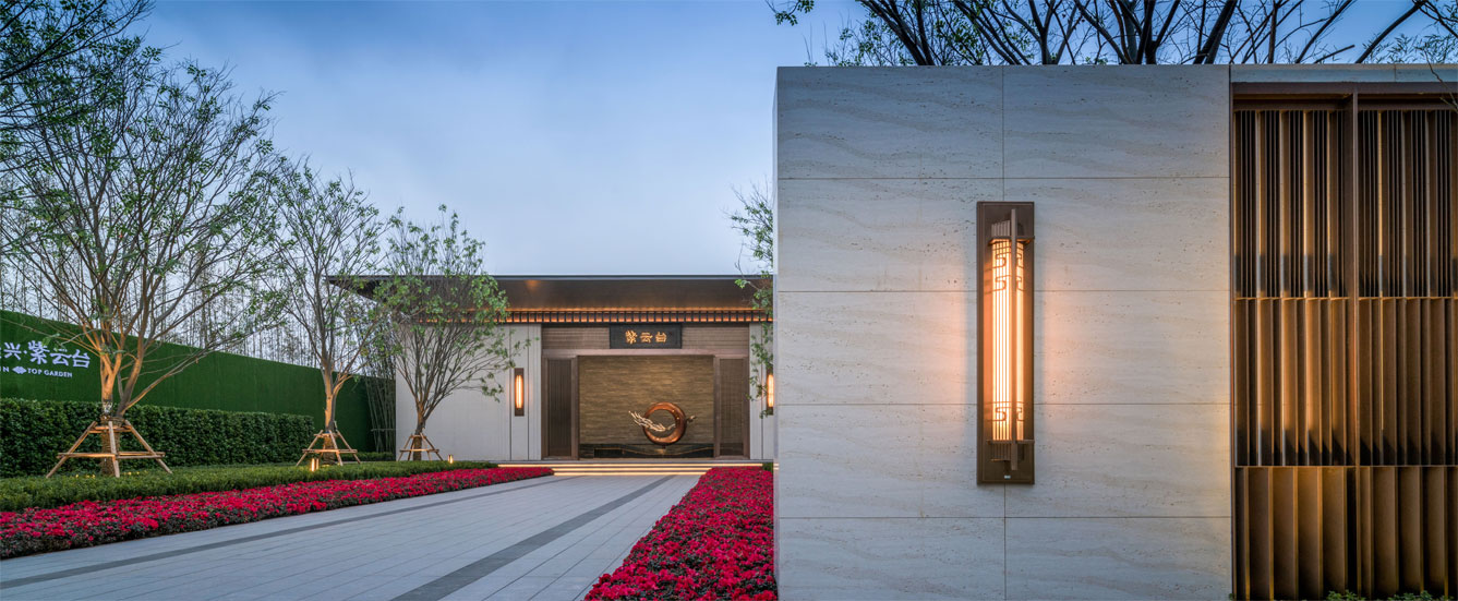 古時,有門,必有壁。中式建筑特有的部分,具有藏風(fēng)納氣的吉祥寓意,增加了門前廣場的內(nèi)聚力,造成對景效果。將高山流水的意境置入園區(qū)景墻內(nèi),晝與夜的交替,時間洪流的穿梭。賦予景觀內(nèi)涵文化,詮釋古典韻味,收納東方禮序于歸家伊始,呈現(xiàn)傳統(tǒng)風(fēng)雅。
