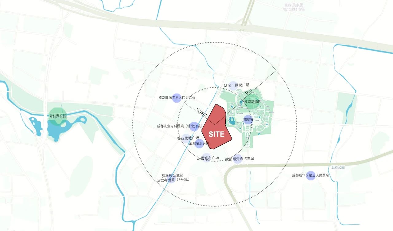 本案位于四川省成都市成華區(qū),昭覺(jué)寺南路與中環(huán)路昭覺(jué)寺橫路段交叉口東北側(cè),街角界面向城市打開(kāi)。毗鄰綠化覆蓋高達(dá)88.41% 的昭覺(jué)寺城市綠肺區(qū),主城內(nèi)最大城市公園海濱公園。設(shè)計(jì)師希望建造一座成都的又一奢尚中心,延續(xù)商業(yè)氣息秉持奢侈品店般的輕奢質(zhì)感,提升整個(gè)城市的審美語(yǔ)境,展現(xiàn)一種高規(guī)格的生活理念。