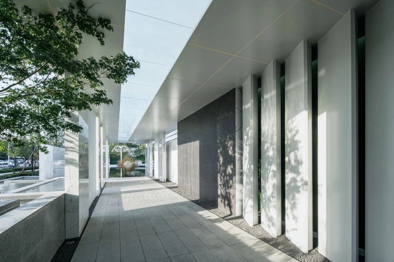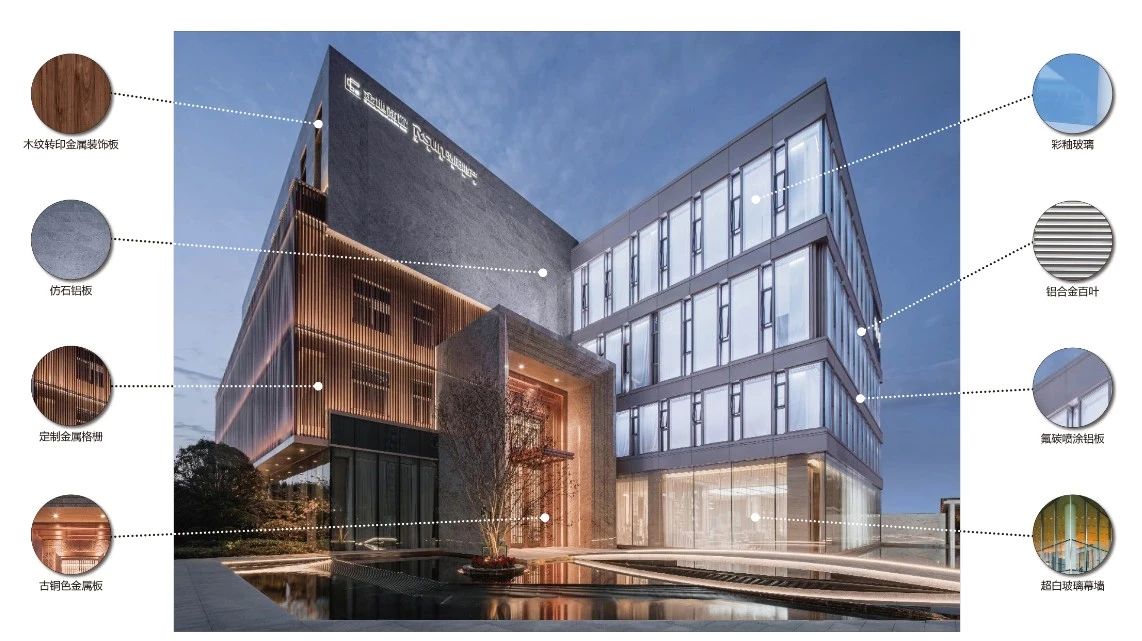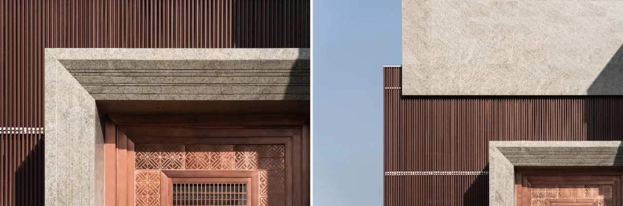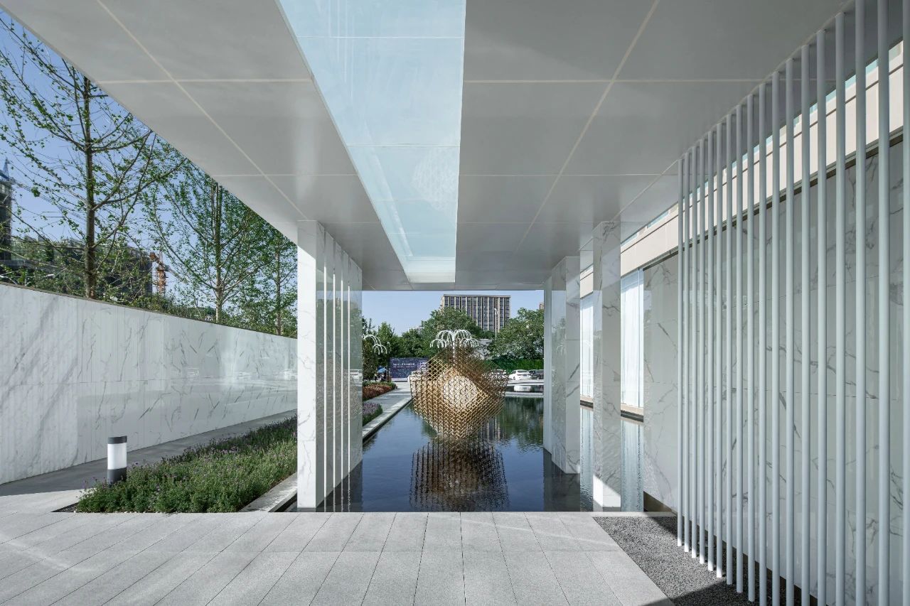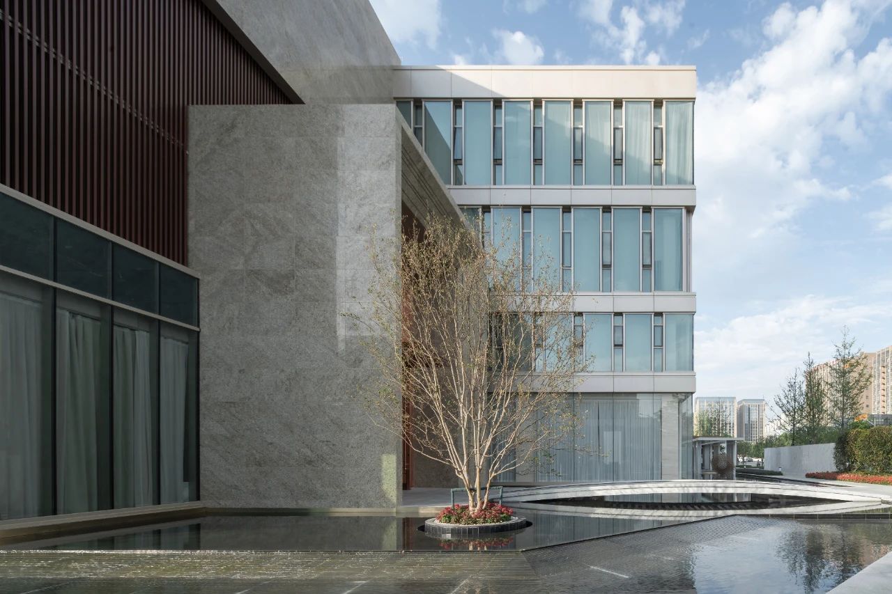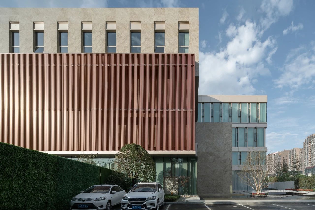 立面材料分兩個(gè)主要元素,入口處運(yùn)用米黃色石材和鋁合金格柵幕墻的交織,整體色彩協(xié)調(diào)性較好,實(shí)體墻和半透明材料的交替形成表面的韻律。表皮以統(tǒng)一而富有變化的造型帶來(lái)強(qiáng)烈的視覺(jué)沖擊,營(yíng)造出一個(gè)潔凈的環(huán)境同時(shí)又是相對(duì)較為素雅輕奢的立面。