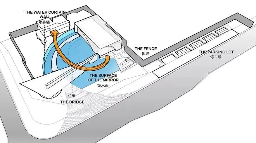 進(jìn)入場地后的主要觀賞空間是眼前的大面積鏡面水景,水景往往給人無限延伸的神秘感和想象力。通過水景人們可以看到周圍的每時每刻變化,她如同媒介,搭起了人與自然溝通的橋梁。
